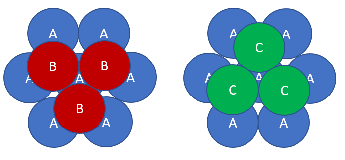 The closest packing of spheres in two dimensions has hexagonal symmetry where every sphere has six nearest neighbors. There are two positions that the next close-packed layer can be placed, B or C. Hexagonal close-packing corresponds to a ABAB stacking of such planes.