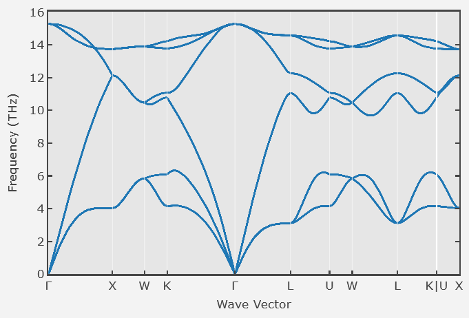 Below is the phonon dispersion relation for a crystal with an fcc Bravais lattice. The lattice constant is a = 0.2 nm.
