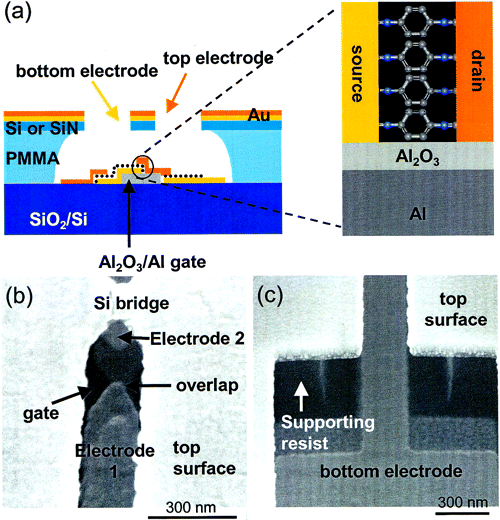 Figure 1 (a) Schematic diagram of the device. The suspended bridge consists of hard baked photoresist or SiO2, and evaporated Si (or SiN). (b) Scanning-electron- microscope (SEM) image of the device that has a contact area of 400 nm2. For clarity in SEM imaging, samples were tilted 45o. (c) SEM image that shows that the top surface is far away from the substrate (> 500 nm) and that the supporting middle layer features a large undercut. Thus, we can measure the transport properties of the devices without a lift-off step in the fabrication.