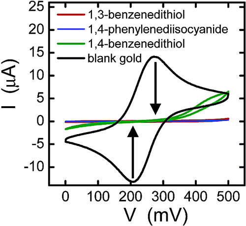 Figure 2 Cyclovoltammogram of 1 mM K4[Fe(CN)6] and 0.5 M KCl (scan rate 100 mV/s) on the Au electrodes covered with different molecules. This constitutes an important test of the molecular coverage of the gold and is thus a test of the quality of the SAMs. The black curve shows the redox peak resulting from a bare Au electrode. The colored lines give the results for SAM-covered Au; indeed the redox peaks have vanished. The green curve shows the cyclic voltammogram for the sample covered with 1,4-benzenedithiol molecules, which is different from the other curves at high bias. This behavior may indicate that 1,4-benzenedithiol SAMs become conductive at these conditions. In fact, all the devices fabricated with 1,4-benzenedithiol showed a very small resistance, which is difficult to distinguish from shorts between source and drain electrodes that result from imperfections in the SAM.