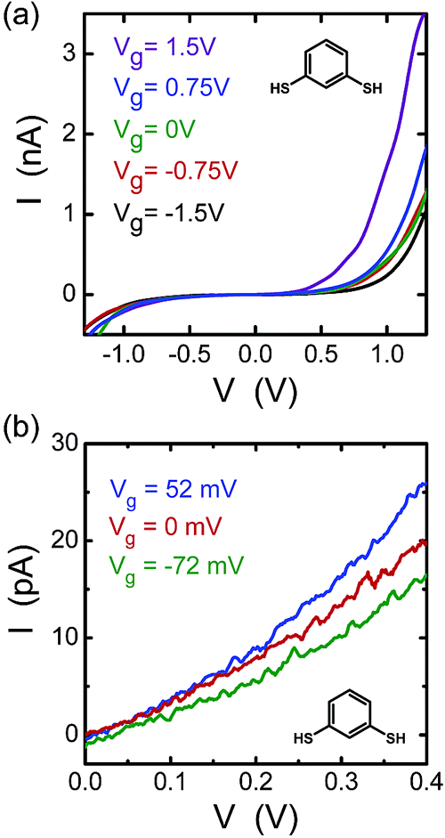 Figure 3 (a) I-V characteristics of a 1,3-benzenedithiol SAM between Au electrodes for various values of the gate voltage. (b) I-V characteristics of a 1,3-benzenedithiol SAM sandwiched between Pt electrodes. Due to a leakage current between Pt and Al/Al2O3 electrodes, only a limited range of gate voltage could be applied. All data were taken at room temperature.