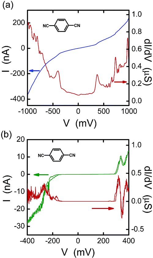 Figure 4 (a) I-V and dI/dV-V curves measured for a 1,4-phenylenediisocyanide SAM at 4.2 K. The contact area was about 104 nm2. (b) I-V and dI/dV-V characteristics for 1,4-phenylenediisocyanide from the sample with a small (~400 nm2) contact area.