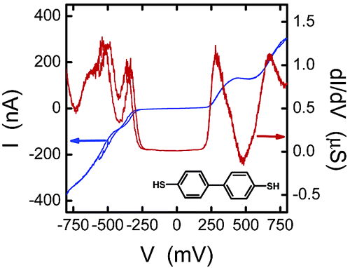 Figure 5 I-V curve and dI/dV-V of a biphenyldithiol device measured at 4.2 K.