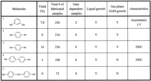 The molecules are (1) 1,3-benzenedithiol; (2) 1,4-benzenedithiol; (3) 1,4-phenylenediisocyanide; (4) 4,4'-biphenyldithiol; and (5) 4,4'-ethynediyl-di-benzonitrile. Molecules 1, 2, and 3 were purchased commercially from Aldrich Chemicals and Tokyo Kasei, respectively. Molecule 4 was synthesized for this work according to ref 6 by M.S., and molecule 5 was synthesized for this work by R.E. as shown in the table; the yield of the devices was low, and gate dependences were observed only in two samples. A remarkable finding is that we obtained almost the same yield of devices for both vapor and liquid growth of SAMs for short molecules. NDC stands for the observation of negative differential conductance.