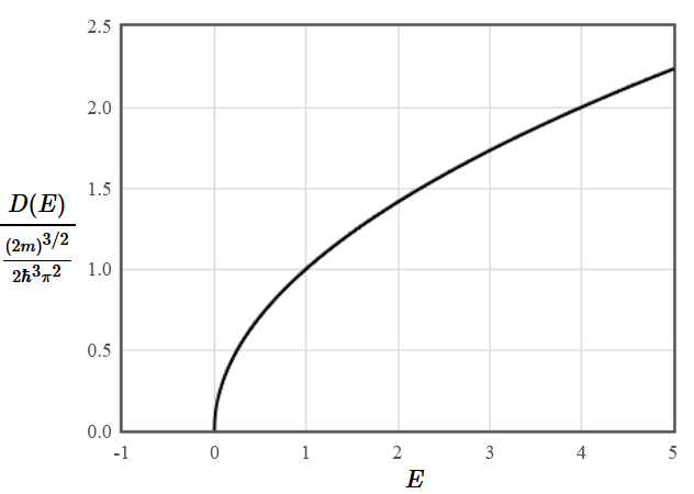 $$D(E) = \frac{1}{L^3}\frac{dN}{dE} = \frac{(2m)^{\frac{3}{2}}}{2\hbar^3\pi^2}\sqrt{E}$$
