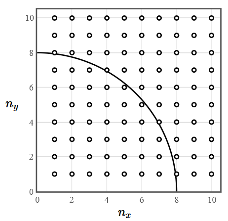 If many electrons are in the lowest energy levels of a two-dimensional infinite square well, then the states will be filled to an energy $E$ which will correspond to a quarter circle in the $n_x - n_y$ plane.